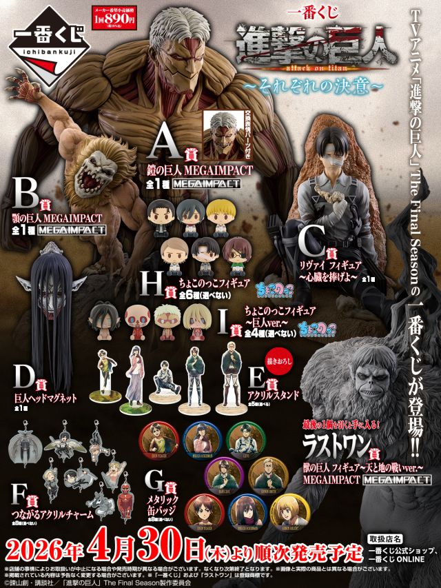 2026年4月30日より、一番くじ 進撃の巨人 ~それぞれの決意~が順次発売されます。